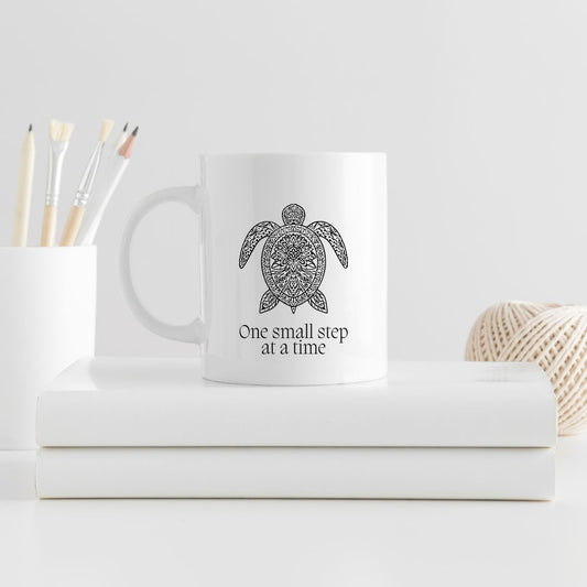 One Small Step At A Time White Ceramic Mug, 11 oz With The Image Of Mandala-Turtle