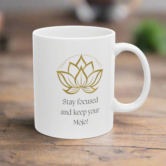 Stay Focused and Keep Your Mojo White Ceramic Mug, 11 oz with the Image Lotus Flower